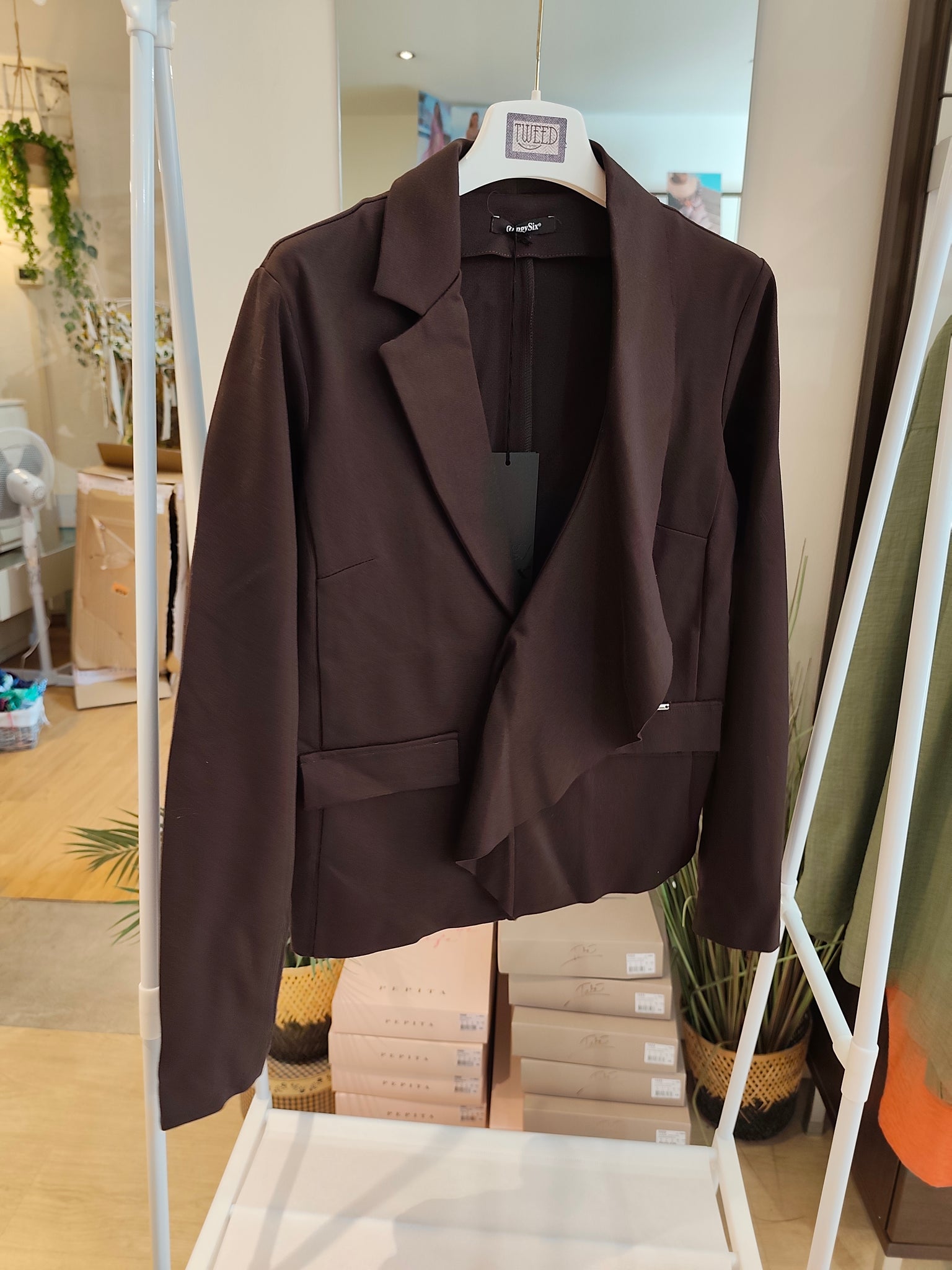 Giacca in jersey di viscosa elasticizzata con bottone singolo e dettaglio a frappa sul lato